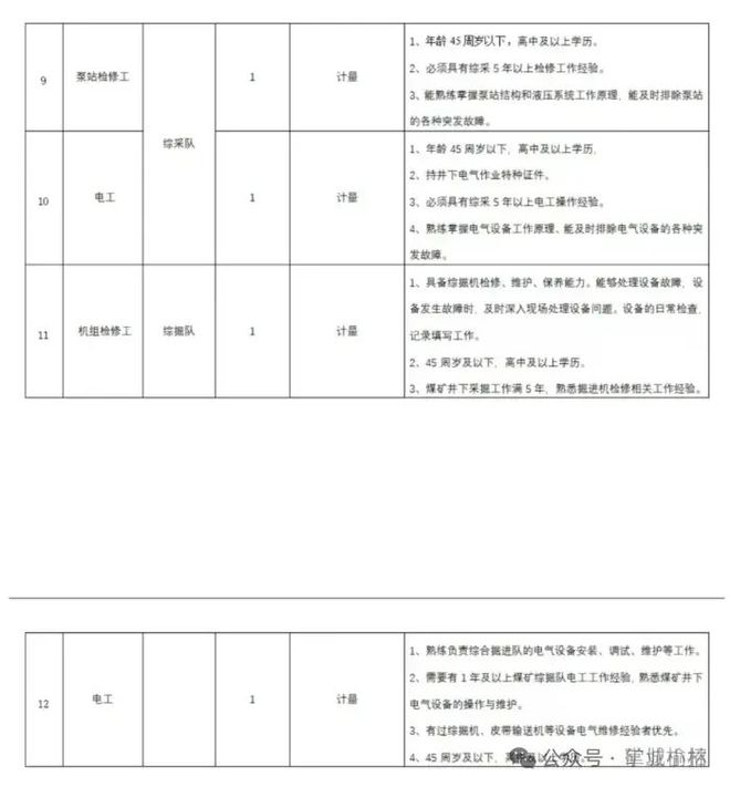 不超48周岁(以招聘报名时间准为计算),井掘下进迎头工、井下电工、综掘机司机特等殊工种岗位特别优者秀年龄者可适当宽放到50岁;身体健康,无业职病史,高无血压、心脑管血病史,无其他不适应下井一线工作的病疾;具有煤掘矿进、机等电相关工经作验;岗位:进掘机司机、掘进支护工、机电工、安装工、皮带检修工、焊工、辅助工遇待:与项目合签同、缴五纳险,工资10000-15000,有转山集能团正式工的会机!