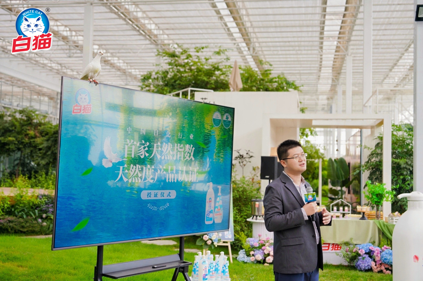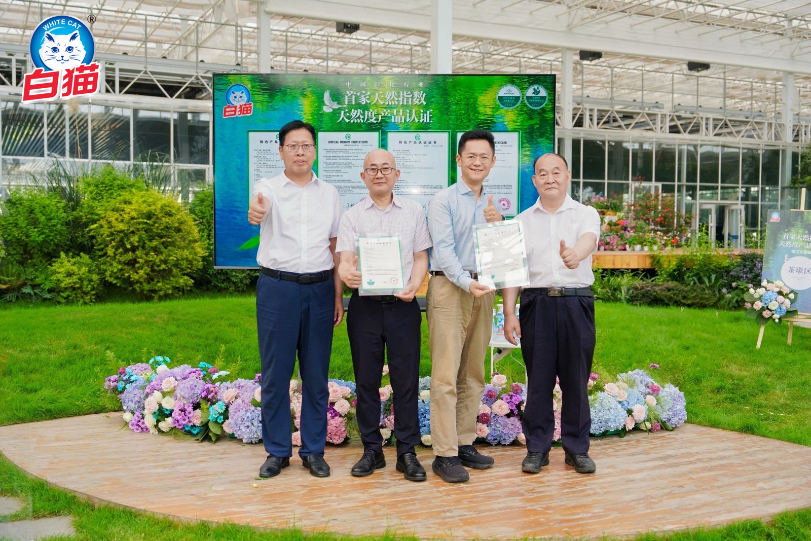 北京中轻联认证中心有限公司主任、中国轻工业出版社有限公司、董事长王献新为白猫品牌颁发中国日化行业首家天然来源认证证书;中国日用化工协会理事长王万绪为白猫品牌颁发中国日化行业首家天然度认证证书。