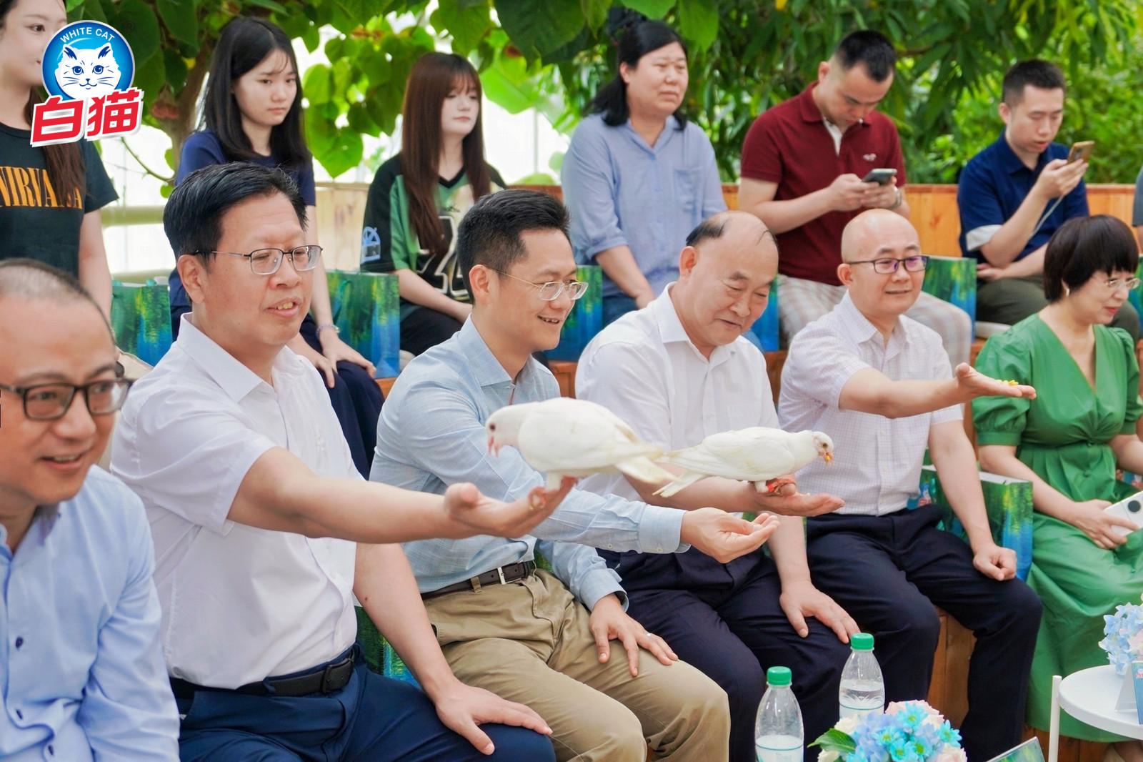 随着一行白鸽的放飞,活动也达到了:承载认证证书的无人机,破空而来!——它无声的航迹,是对白猫‘天然承诺’的极致践行:不惊扰一片云,不染尘一寸天!